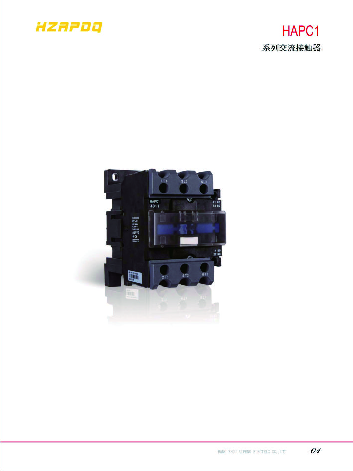 HAPC1(Z、ZE)-09~95系列交流接触器(以下简称接触器),主要用于交流50Hz(或60Hz),额定绝缘电压为1000V,在AC-3使用类别下额定工作电压为415V时额定工作电流为9A~95A的电路中,供远距离接通与分析电路及频繁起动、控制交流电动机:并可与适当的热过载继电器组成电磁起动器,以保护可能发生过负荷的电路。